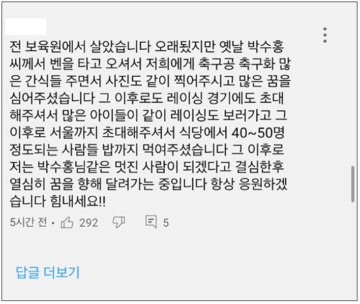 어떤 보육원에서 살으신 분의 미담내용입니다. 당시 사연자분이 어렸을적 보육원에서 생활하셨을 당시, 박수홍님이 찾아와 축구공, 축구화, 간식을 선물하고, 레이싱 경기장에도 데려가고, 서울에도 데려가 밥도 사주셨다고합니다.