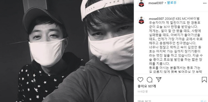 경동호와 절친한 친구인 가수 모세도 이날 자신의 인스타그램을 통해 "2004년 KBS MC 서바이벌 우승자이자 제 절친이기도 한 경동호 군이 오늘 뇌사 판정을 받았다"라고 비보를 알렸습니다.