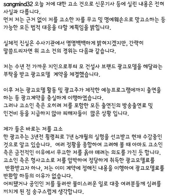 허무맹란한 고소 건으로 금전적인 이유에서 무고한 저를 옭아매려는 의도를 가진거 같다고 전했습니다.