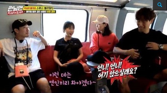 근데 럭셔리 패키지팀이 열차를 타고 가던중에 열차 좌석 자리 배치 문제로 강한나가 안절부절하는 모습을 보였는데요. 한창 러브라인 형성중인 김종국 홍진영 사이에 강한나가 앉아서 가게된 것,
