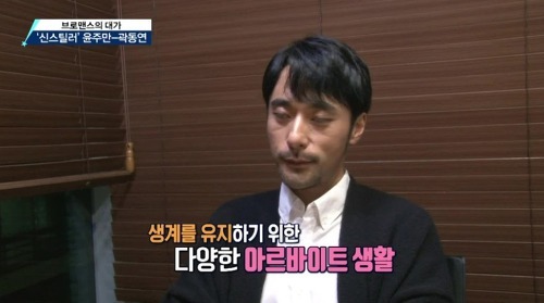 윤주만 역시 어렸을 때부터 힘들게 성장을 했다고 합니다. <어렸을 때 굉장히 힘들게 살았다. 아버지가 사기를 당하고 아버지랑 어머니랑 헤어졌다. 압류 들어와서 딱지 붙이고 가스로 물을 끓여서 쓰다가 가스마저 끊겨서 참고 참다가 찬물로 샤워하고 최대한 배고플 때까지 참았다가 라면을 먹었다. 돈이 필요해서 이삿짐, 패스트푸드, 막노동 등의 아르바이트를 했다>