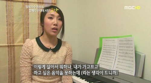 (초반 부분에 명성희가 탈북 이유에 대해서 설명하고, 그 이후에 노래를 부르는데, 목소리가 아주 맑고 청아하네요.)