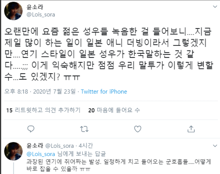 "오랜만에 요즘 젊은 성우들 녹음한 걸 들어보니 지금 제일 많이 하는 일이 일본 애니 더빙이라서 그렇겠지만 연기 스타일이 일본 성우가 한국말하는 것 같다 이게 익숙해지만 점점 우리 말투가 이렇게 변할 수도 있겠지? ㅠㅠ"