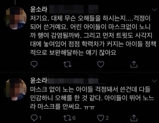 그러면서 “대체 무슨 오해들을 하시는지. 걱정이 되어 쓴 거다. 어린아이들이 마스크 없이 노니까 행여 감염될까 봐. 그리고 먼저 트윗도 사각지대에 놓여 있어 점점 학력 차가 커지는 아이들 정책적으로 보완해달라는 얘기다”라고 덧붙였습니다.