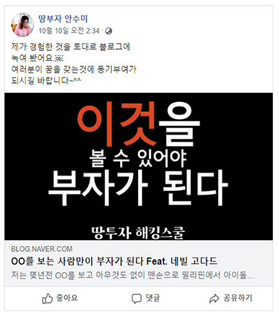 안수미는 자신의 블로그에 올린 부동산 투자 홍보 영상에서 피자를 앞에 두고 "이게 공유 지분이다. 하지만 이 조각 피자를 내가 먹는다고 한 판의 피자 맛과 다르냐"고 설명했습니다.