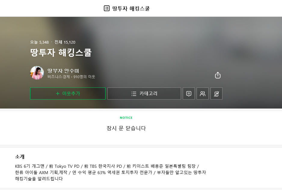 현재 안수미가 운영중인 네이버 블로그 '땅투자 해킹스쿨'은 공지를 통해 잠시 문을 닫는다고 전했습니다.