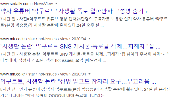 그런데, 4.27일 약쿠르트(약사 유튜버) 사생활 논란이 터졌다.