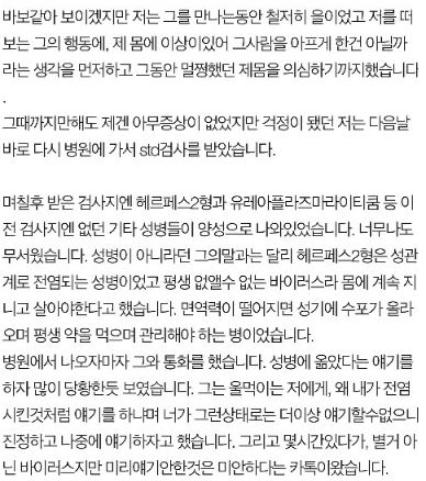 글쓴이는 “이미 자신에게 성병이 있는 걸 인지하면서도 최소한의 안전장치도 없이 계속 관계를 하고 미리 얘기도 해주지 않았던 것, 제가 성병에 옮은 걸 알고 회피하며 절 버렸던 것, 그리고 다시 찾아와서도 저를 그저 잠자리 도구로만 생각하며 자신의 즐거움만을 위해 절 이용했던 것. 이 모든 것들은 그 사람에게 얻은 육체적인 피해보다 더 아픈 마음의 상처다”라고 토로했다.