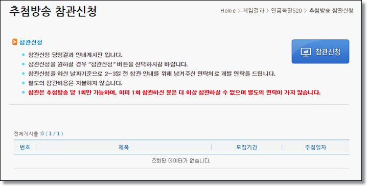 혹시 재미삼아 추첨방송에 가고 싶다면 참관신청 게시판을 통해 신청할 수 있습니다. 신청하면 날짜기준으로 2~3일 전에 참관 안내 연락이 가며 참관비용은 별도로 없습니다. 한번 참관한 분들은 참여할 수 없으며 별도의 연락이 가지 않는다는점 참고하시기 바랍니다.