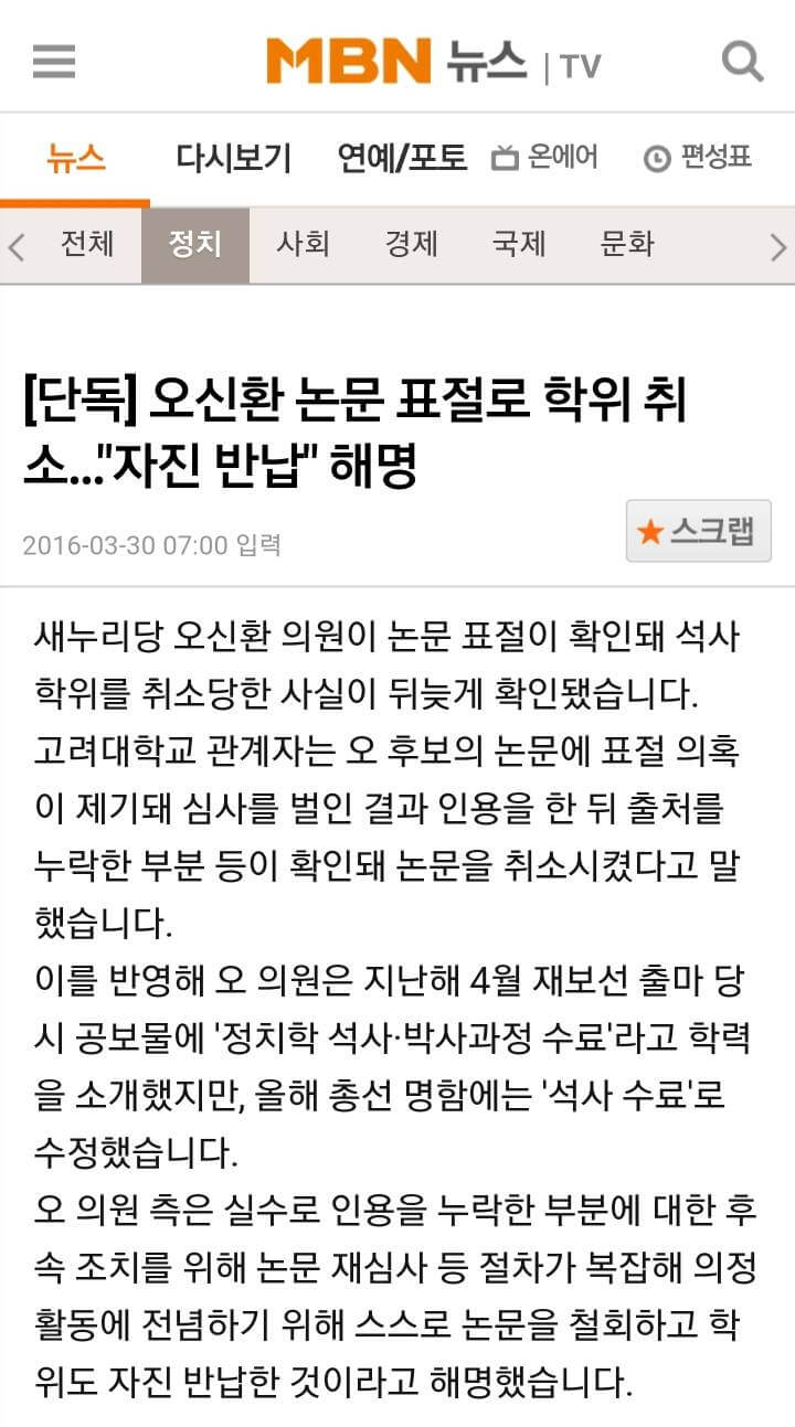 이에 고려대 측은 오 전 의원 논문의 표절 여부를 가리기 위한 위원회를 구성해 집중적인 심사를 벌였고, 그 결과 타 논문을 인용한 후 출처를 누락하는 등의 부분이 확인되면서 결국 해당 논문을 취소 시켰습니다.