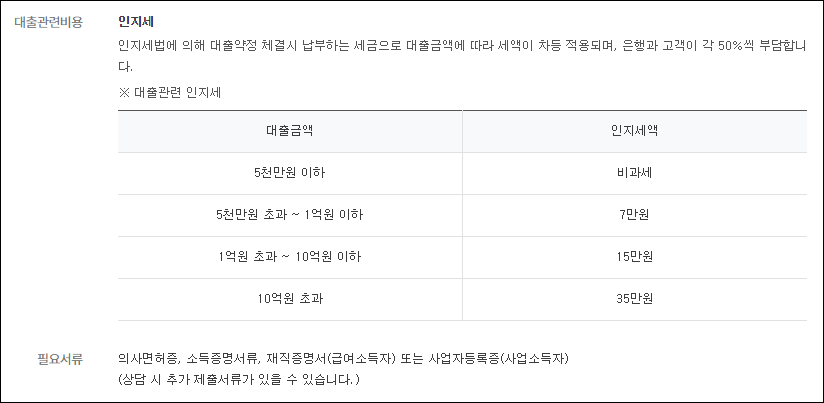 이용금액에 따라 인지세 부과여부가 나뉘며 5천만원 초과할 경우 은행과 고객이 각각 50%씩 부담해야 되며 최소 7만원~최대 15만원까지 부과될 수 있습니다.