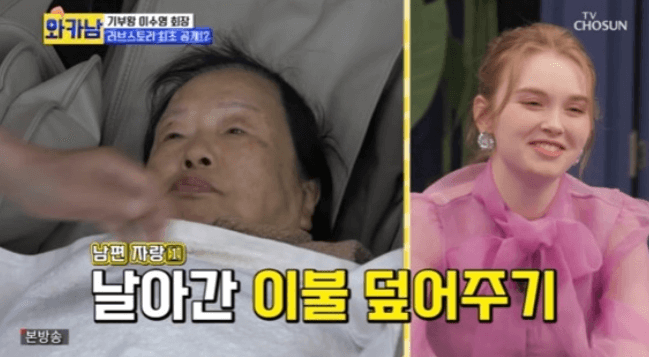영상을 보던 이수영 회장은 "혼자 사니 밤에 전깃불을 못 꺼"라고 결혼 전 불편한 점을 밝혔는데요. 결혼 후에는 남편인 김창홍 변호사가 잔신이 덮는 이불을 정리해주고, 약도 챙겨준다고 합니다.