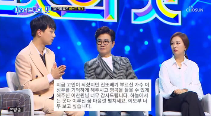 또 진또배기를 부른 '故 이성우'의 조카가 댓글을 남겨 화제이기도 했습니다. 조카는 "지금 고인이 되셨지만 진또베기를 부르신 가수 이성우를 기억하게 해주시고 명곡을 들을 수 있게 해주신 이찬원님 너무 감사드립니다. 하늘에서는 못다 이루신 꿈 마음껏 펼치세요. 이모부 너무 보고 싶습니다."라는 댓글을 남겨 모두를 감동스럽게 했습니다.