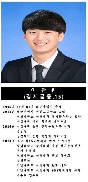 이찬원의 학력을 알아보겠습니다. 초등학교는 '대구선원초등학교', 중학교는 '성곡중학교', 고등학교는 '경원고등학교'로 초중고를 모두 대구에서 보냈습니다. 대학은 '영남대학교'로써 경제금융학부 15학번입니다.