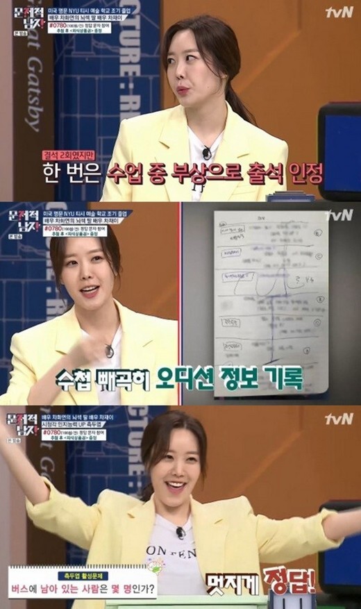 당시 문제적 남자로 처음 예능 프로그램에 출연한 차재이는 뉴욕대 티쉬 예술학교 조기 졸업은 물론 4개 국어 가능, 미국 대입 시험인 SAT 수학 과목 만점 등 남다른 뇌섹미로 눈길을 끌었는데요, 또한 차재이는 장진 감독이 연출한 연극 꽃의 비밀에 캐스팅 된 비하인드 스토리를 공개해 문제적 남자 멤버들의 탄성을 자아내기도 했습니다.