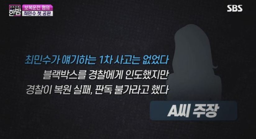 피해자는 최민수가 말하는 1차 사고는 없었고 블랙박스는 경찰에게 인도했지만 경찰이 판독불가라 했다 합니다.