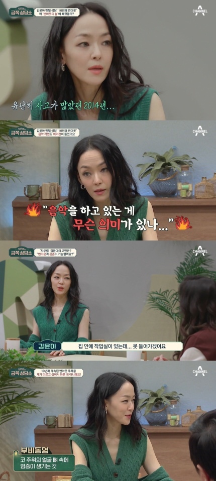 김윤아는 2014년 세월호 사건 이후 번아웃을 겪기 시작했다고 밝히며 음악을 하는 이유를 잃었다고 했어요 "음악이 의미가 없다는 생각에 무력감이 왔고 자괴감에 빠졌다. 이걸 느끼면서도 계속 일을 해서 더 그렇게 된 것 같다"라고 털어놨다. 또 이로 인해 각종 신경통증, 부비동염, 수면장애 등에 시달렸다고 했다. 소화장애를 겪으면서는 살이 많이 빠졌다고 밝히기도. 이날 김윤아는 이전보다 더욱 수척해진 모습을 보여 더욱 안타까움을 안겼다.