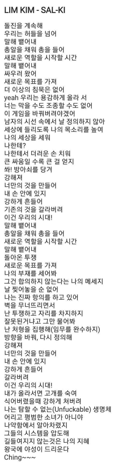 LIM KIM - SAL- KI 가사 해석본이다.
