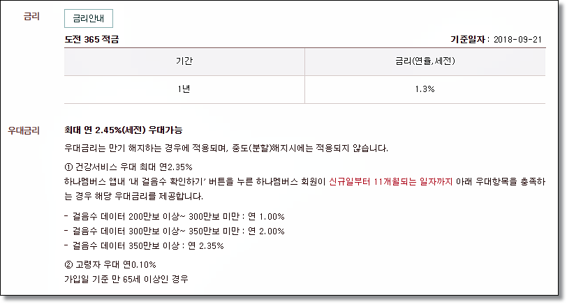 하나은행에서 도전365 적금 상품이 나온 것을 최근에 알았는데요. 이 상품은 걸음 수에 따른 우대금리를 받을 수 있습니다. 굉장히 신선하죠? 그래서 오늘은 하나은행 도전365 적금 금리 및 우대금리 정보를 알아보도록 하겠습니다.