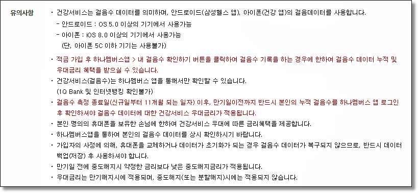 걸음 수를 측정하기 위해서 안드로이드 OS 5.0 이상, 아이폰 IOS 8.0 이상의 기기만 가능합니다. 만 14세 이상 실명의 개인 및 개인사업자면 가능하며 1인 1계좌만 됩니다. 이자지급방법은 만기일시지급식이며 자유적립식입니다.