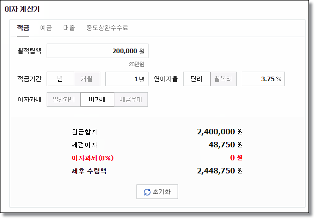 최대 금리 3.75로 월 20만원씩 적립했을 때 비과세 기준 원금은 240만원, 세전이자 48,750원으로 세후 수령액은 2,448,750원을 받을 수 있습니다. 납입금에 비해 굉장히 많은 이자를 얻을 수 있는데 관심있는 분들은 가입하시길 바랍니다.