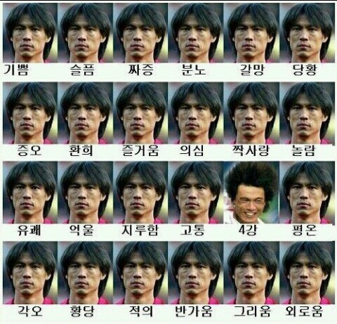 홍명보는 감정 표현이 별로 없는 사람입니다. 인터넷에 떠도는 홍명보의 '감정 퍼레이드 사진'을 보면 4강때를 제외하고는 거의 같은 얼굴들이네요.