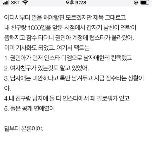 이것에 대해 권민아는 "제가 지금 만나고 있는 남자친구의 전 여자친구의 친구분이 올리신 글인지 모르겠지만 이런 걸로 제가 또 욕을 먹고 일반인인 남자친구에게도 피해가 안갔으면 해서 글을 올린다"라고 시작했습니다.