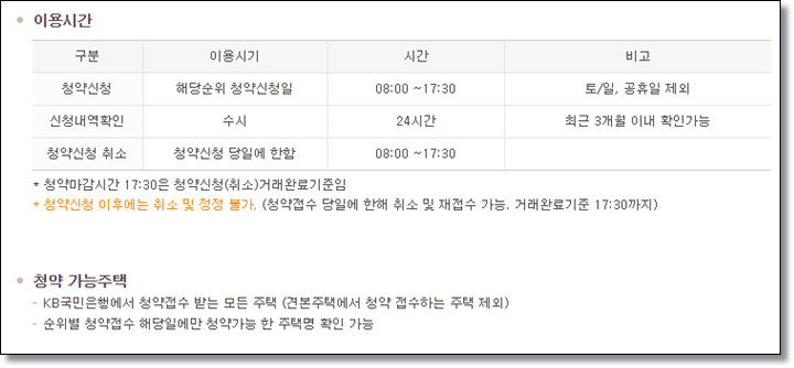 청약신청의 경우 오전 8시부터 오후 5시 30분까지 가능하며 토요일과 일요일, 공휴일은 신청이 불가능합니다. 단, 신청내역은 24시간 수시로 가능하며 취소는 신청한 당일 오전 8시부터 오후 5시 30분까지 취소할 수 있습니다. 청약 가능한 주택은 국민은행에서 접수를 받는 모든 주택이 가능하다는점 참고하시기 바랍니다.