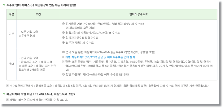 이 상품을 추천하는 이유는 오프라인 은행을 방문하지 않고, 온라인으로 가입할 수 있으면서도 높은 금리가 적용된다는 점인데요. 내지갑통장과 연동되어 있는 계좌 한해서 수수료 면제혜택이 주어집니다.