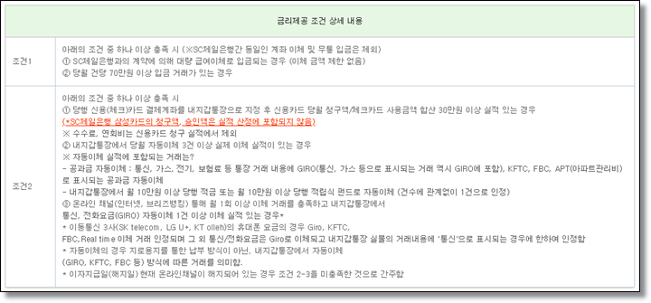 조건은 위 내용과 같습니다. 당월 건당 70만원 이상 입금 거래가 있고, 신용(체크)카드 결제계좌를 내지갑통장으로 지정한 후 월 사용액이 30만원 이상 실적이 있을 경우 조건1과 조건2를 충족시킬 수 있습니다. 간단하죠?