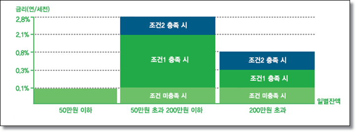 내지갑통장의 경우 조건을 충족해야만 높은 금리가 적용됩니다. 조건1과 조건2가 충족될 경우 최대 2.8%의 우대금리를 받을 수 있으며 조건 미 충족 시 0.1%의 이율이 적용됩니다. 대부분 돈을 모으려고 예금 상품을 가입하는 것이니까 조건을 충족시켜 높은 이율을 받아보시기 바랍니다.