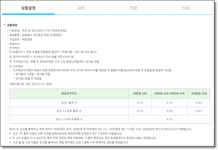 입출금이 자유로운 예금으로 가입금액은 없으며 일별이자는적용이율별 당일말잔 합산액X적용이율/365으로 계산되어 일별이자가 주어집니다.