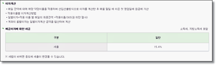 이자 계산은 매일 잔액에 대해 해당 약정이율을 적용해 매월 말일에 이은 첫 영업일에 원금에 가산되어집니다. 일별이자는 적용이율별 최종잔액X적용이율/365을 계산하면 일별이자가 계산되어집니다. 세금은 15.4%가 적용되구요.