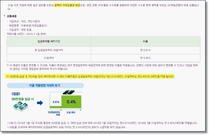월복리 자율입출금 예금으로 매 입금일로부터 30일까지는 연 0.01% 금리가 제공되며, 31일이 지난 이후부터 연 0.40%가 주어집니다. (이율은 언제든지 변경될 수 있으며 변경될 경우 예금잔액에 대해 변경된 이율이 적용됩니다.)